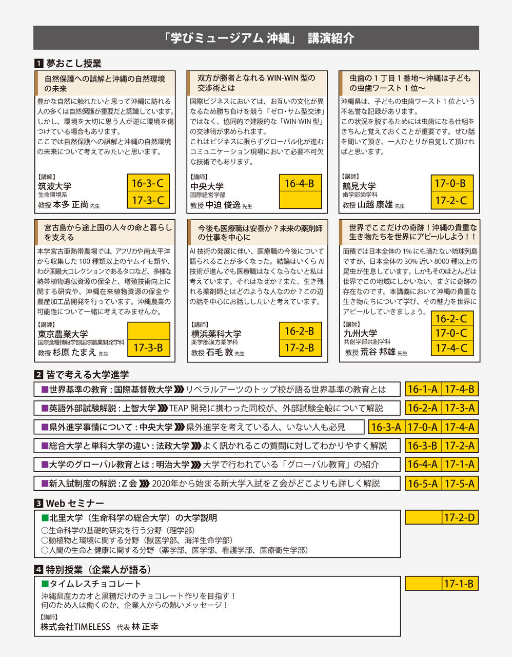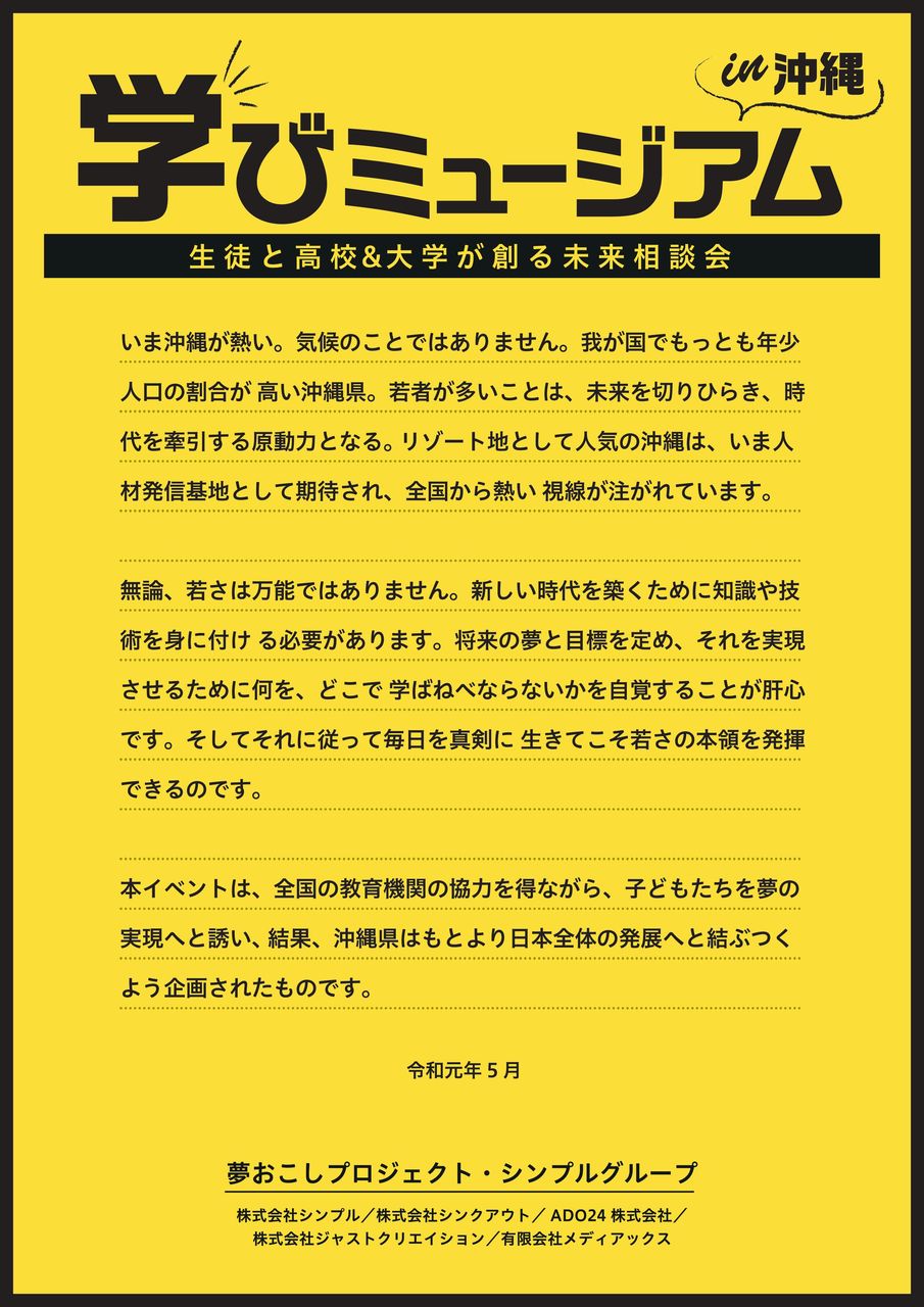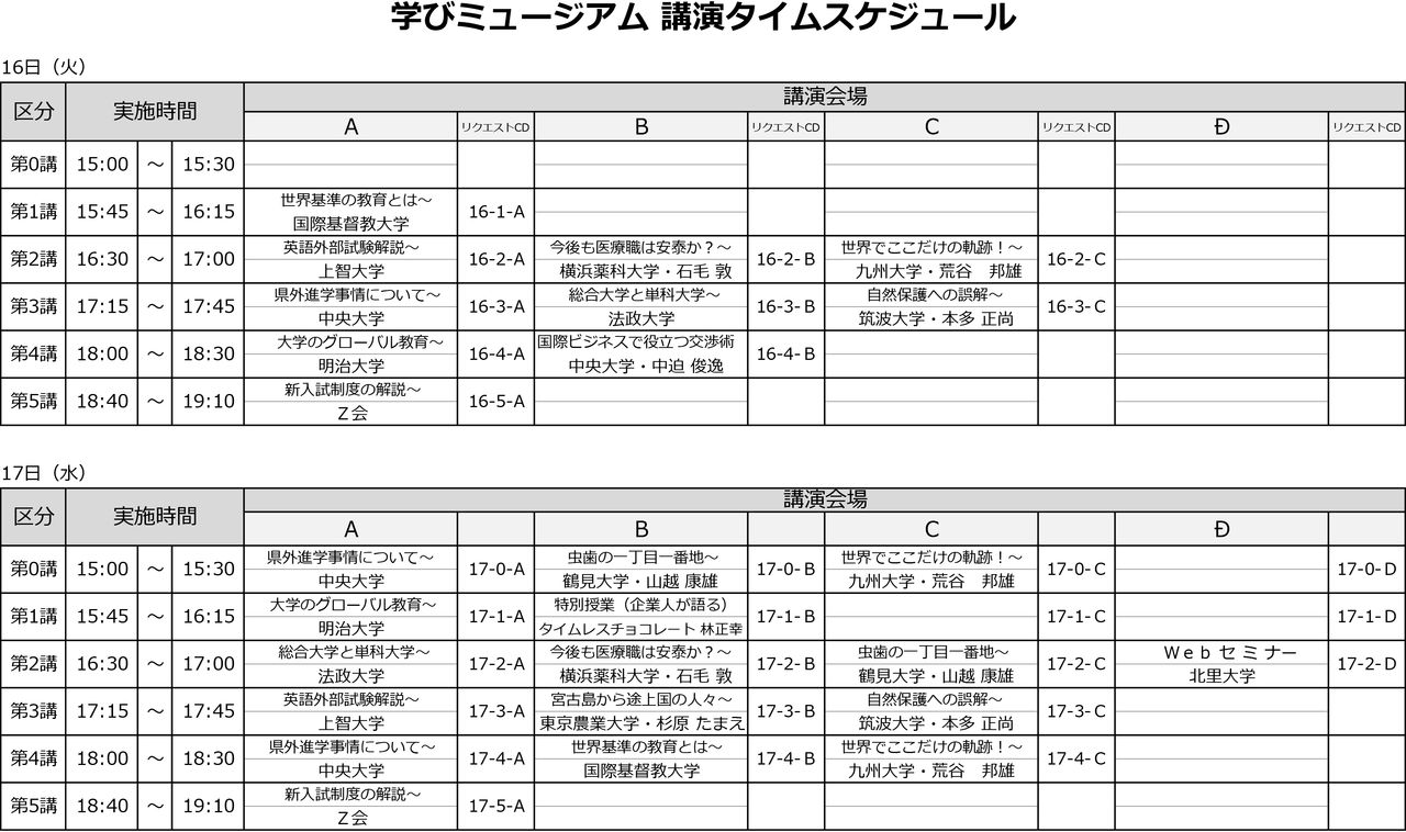 学びミュージアム in 沖縄 - 2019年 大学個別相談&講義体験を同時開催します!参加大学・短期大学やプログラムは下記をご参照ください。 日時: 7月16日(火)・17日(水) / 15:00-19:00会場: ラグナガーデンホテル入退場自由・参加費無料です。奮ってご来場ください。講演の受講には事前のお申込みが必要となります。上記「講演紹介」をご参考に、下記フォームよりお申込みください。高校から会場までの無料送迎バスのお申込みは進路指導室でお申込みください。 「イベント」カテゴリの最新記事